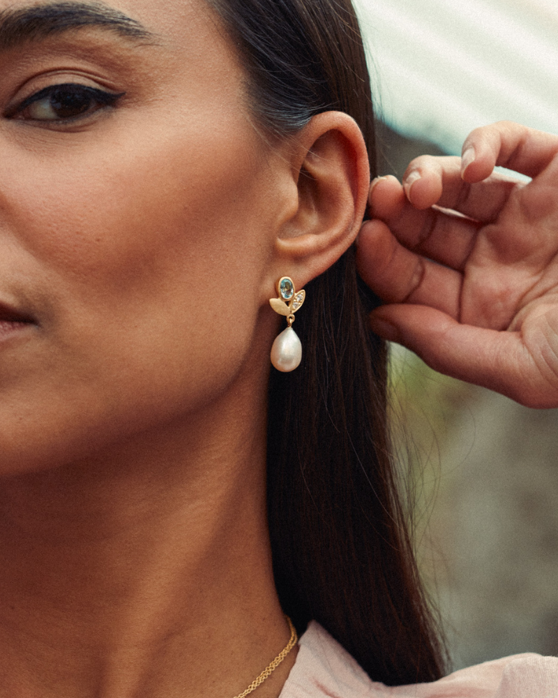 Our pretty Dahlia earrings are an easy to wear style, perfect for everyday wear. Featuring a blue topaz top, a duo of crystals and a pearl drop. This playful style is for those that love a pearl earring with a little something extra.  Crafted in 925 sterling silver and finished with an 18 carat gold vermeil.