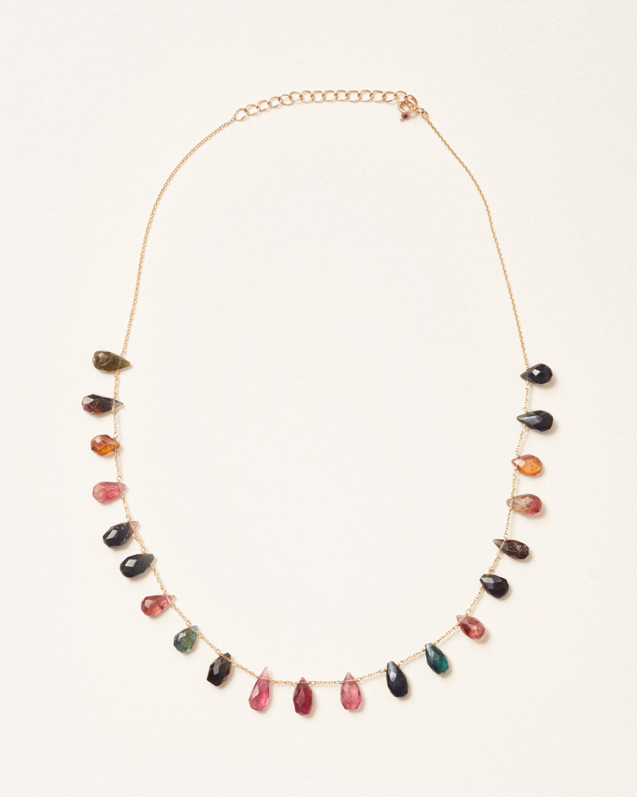 This stunning and delicate necklace is a true modern heirloom. This is a complete one off, crafted in solid 18 carat gold and featuring several faceted tourmaline drops. Wear alone everyday or layer with other pieces.