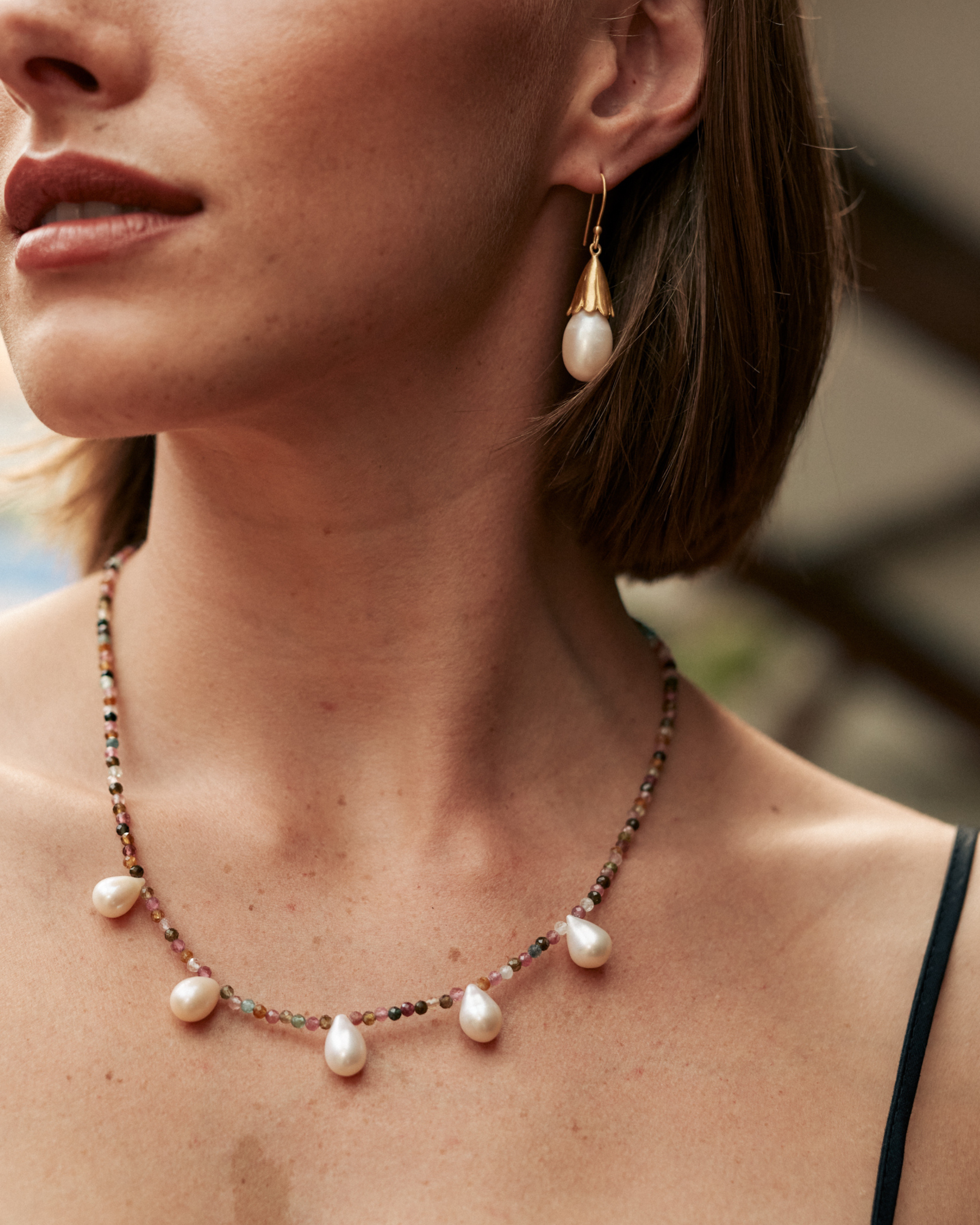 Our Martha necklace features stunning mixed tourmalines and five centrally strung pearl drops. An easy to wear piece that can be dressed up or down.