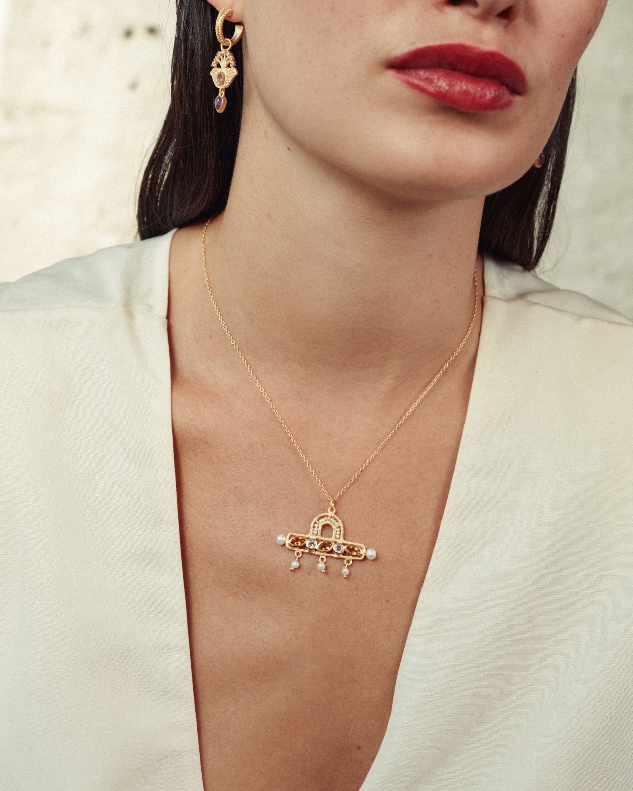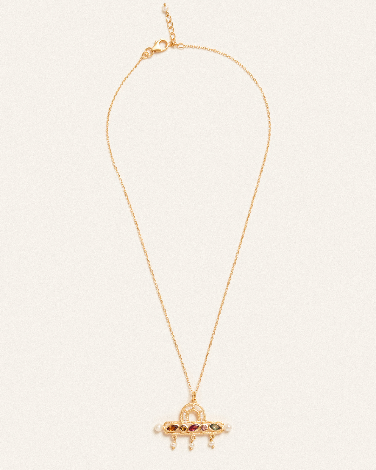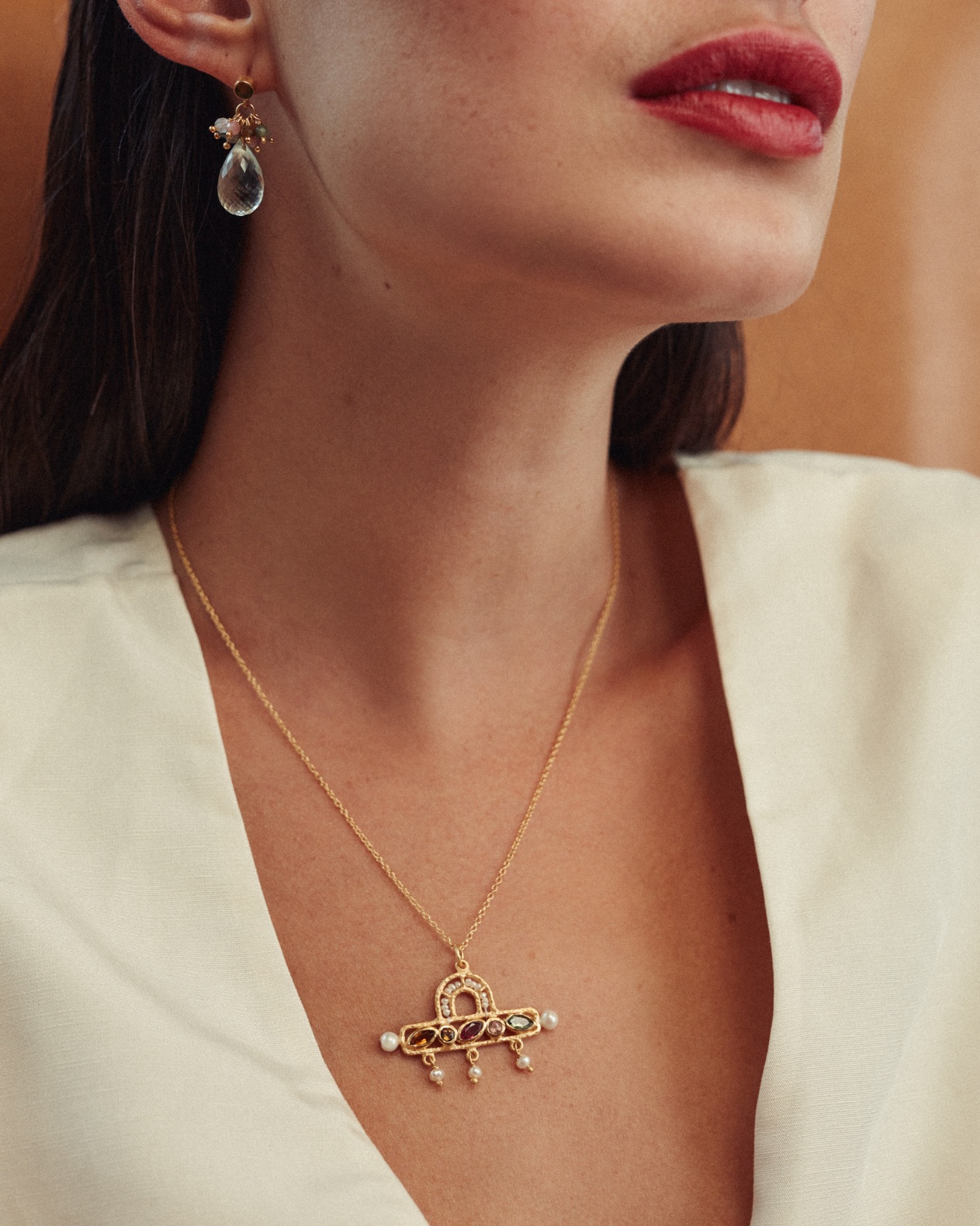 Our beautiful Roxanne pendant features the most intricate pearl detailing, alongside the striking combination of multi tourmaline stones. Made by hand, crafted in 925 sterling silver and finished with a matt gold vermeil.