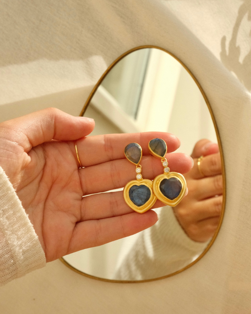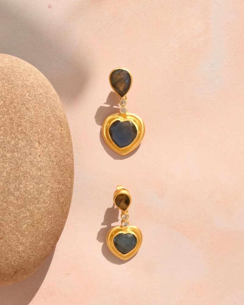 Our Nessa earrings feature a striking hand cut and set faceted labradorite heart. These earrings have been cleverly designed with an invisible joinder between the top part and lower crystals so that this earring moves with you and is never static.  These stunning collection namesake earrings will not go unnoticed.