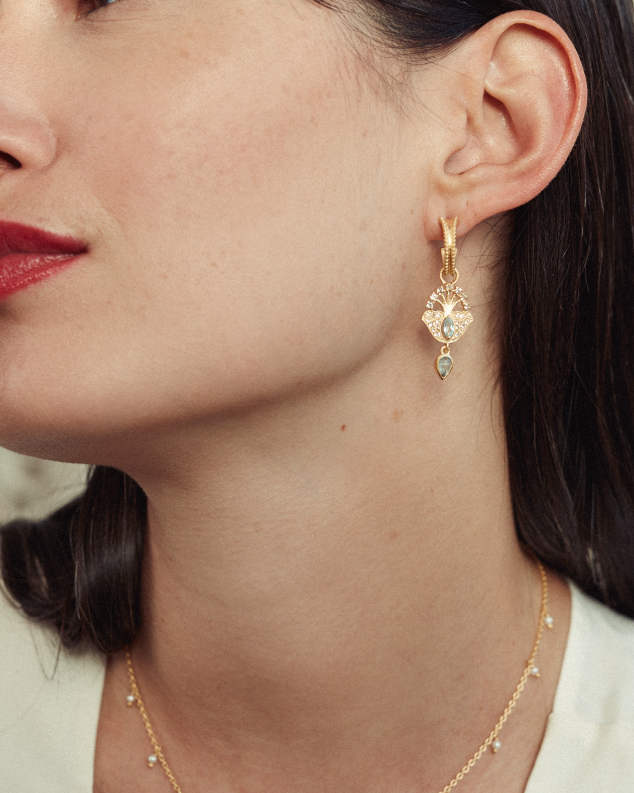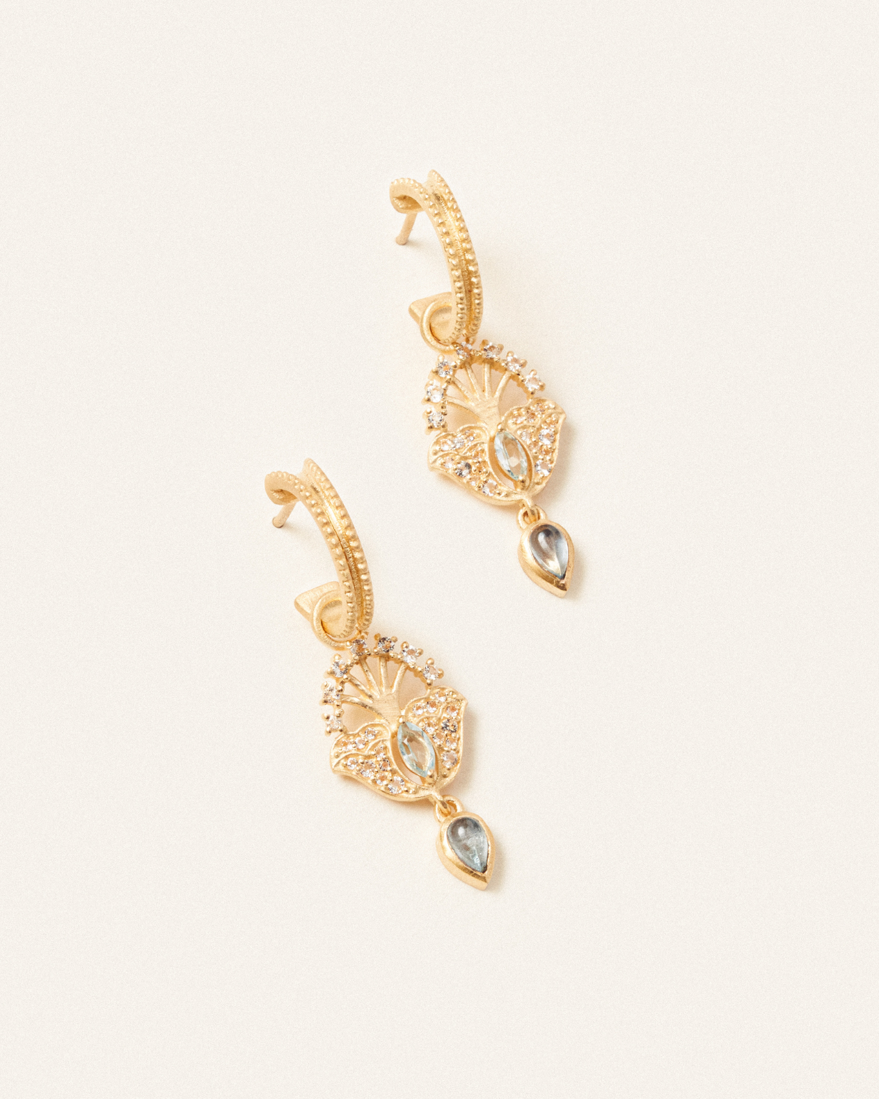 Our lucky peacock earrings are handcrafted in 925 sterling silver and finished with an 18 carat gold vermeil. The hanging blue topaz stone provides plenty of movement and the faceted gems catch the light beautifully when worn.