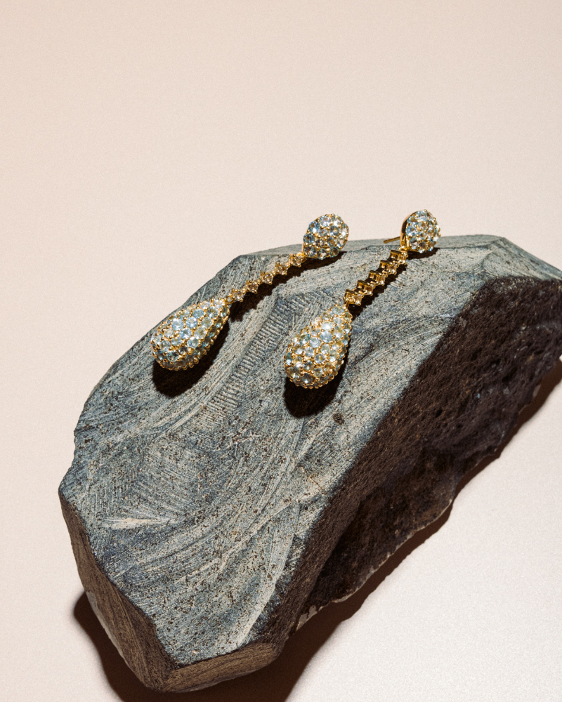 Our show-stopping pendulum earrings are a stunning statement style. Handcrafted in 925 sterling silver and finished with an 18 carat gold vermeil. These earrings are intricately finished with beautiful blue topaz stones and white topaz.