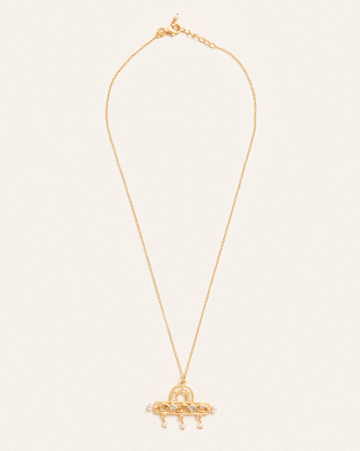 Our beautiful Roxanne pendant features the most intricate pearl detailing, alongside the striking combination of blue topaz and lemon quartz. Made by hand, crafted in 925 sterling silver and finished with a matt gold vermeil.