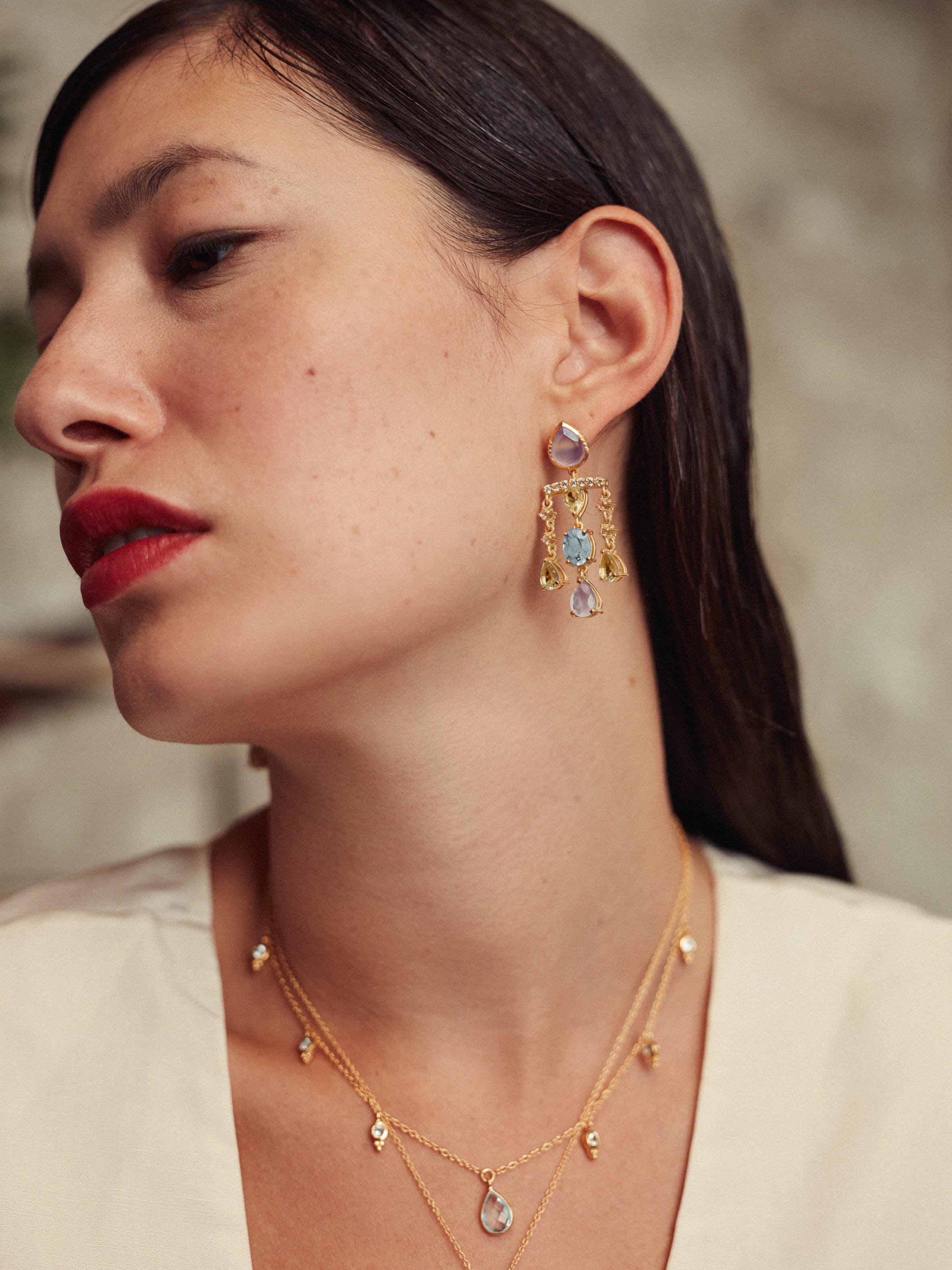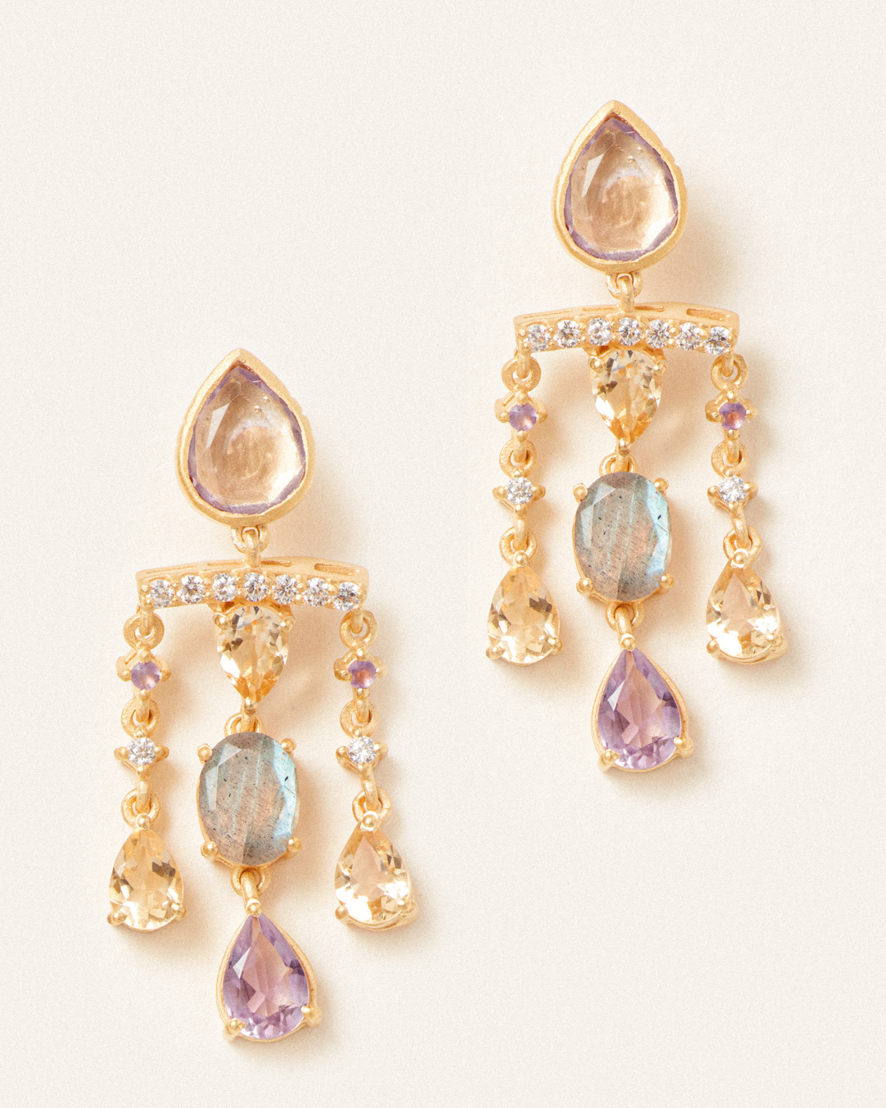 Zita is a stunning statement style in our collection. An earring with plenty of movement that is relatively light for her size. Zita is handcrafted in 925 sterling silver and finished with an 18 carat gold plating. The hanging stones provides plenty of movement and the faceted gems catch the light beautifully when worn. We love this seasonless combination of pink amethyst, citrine and labradorite.