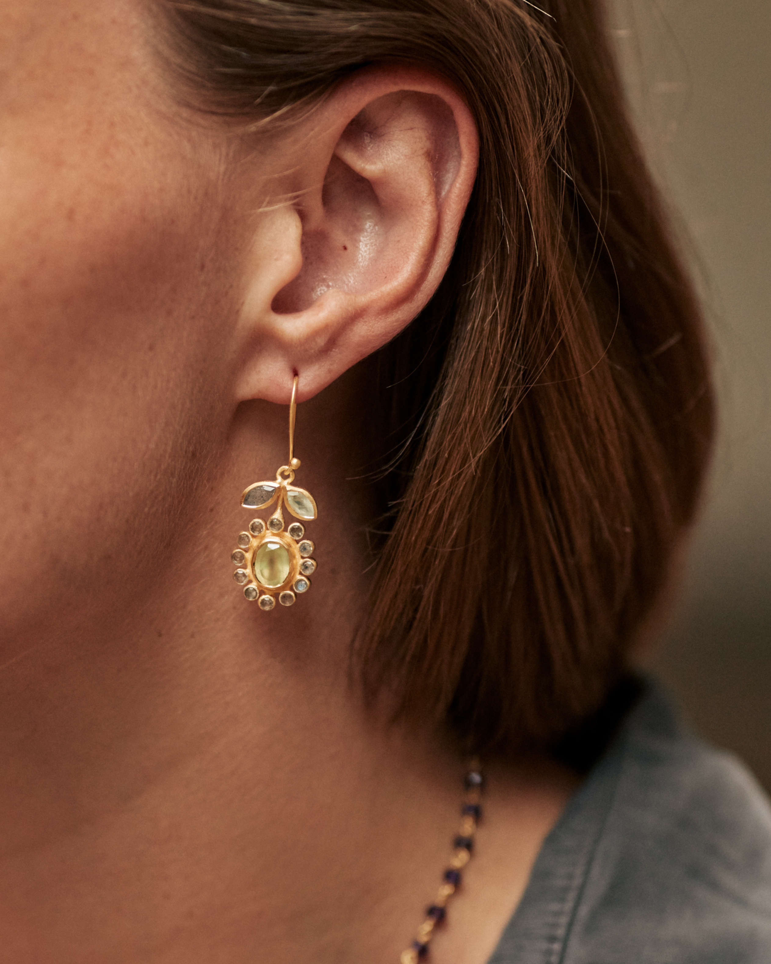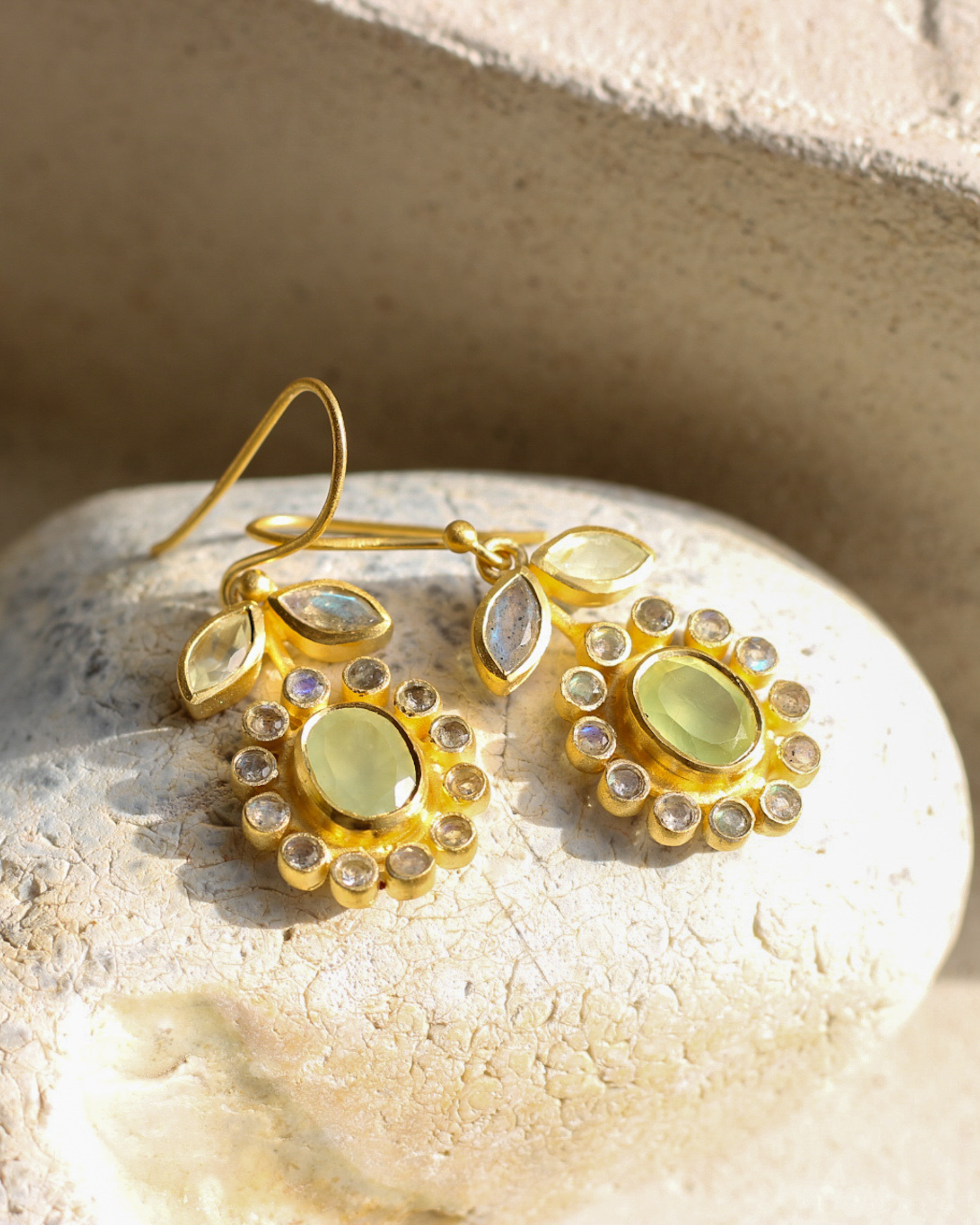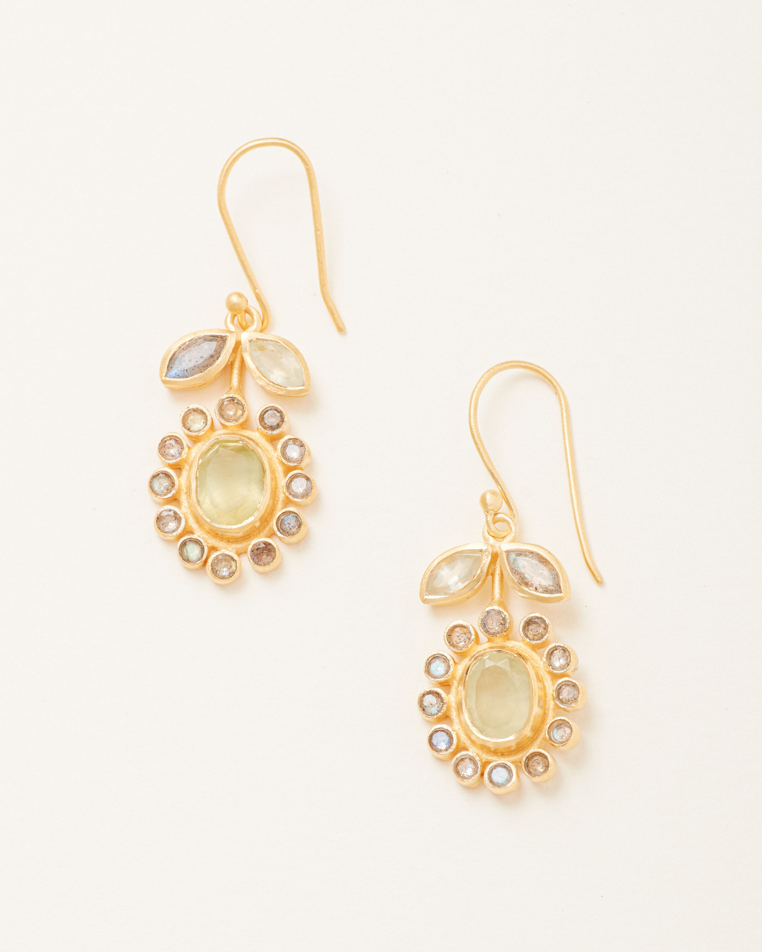 Our pretty and playful Jackie earrings feature a delicate botanical design. This everyday style has been crafted in the calming and beautiful combination of labradorite and prehnite.