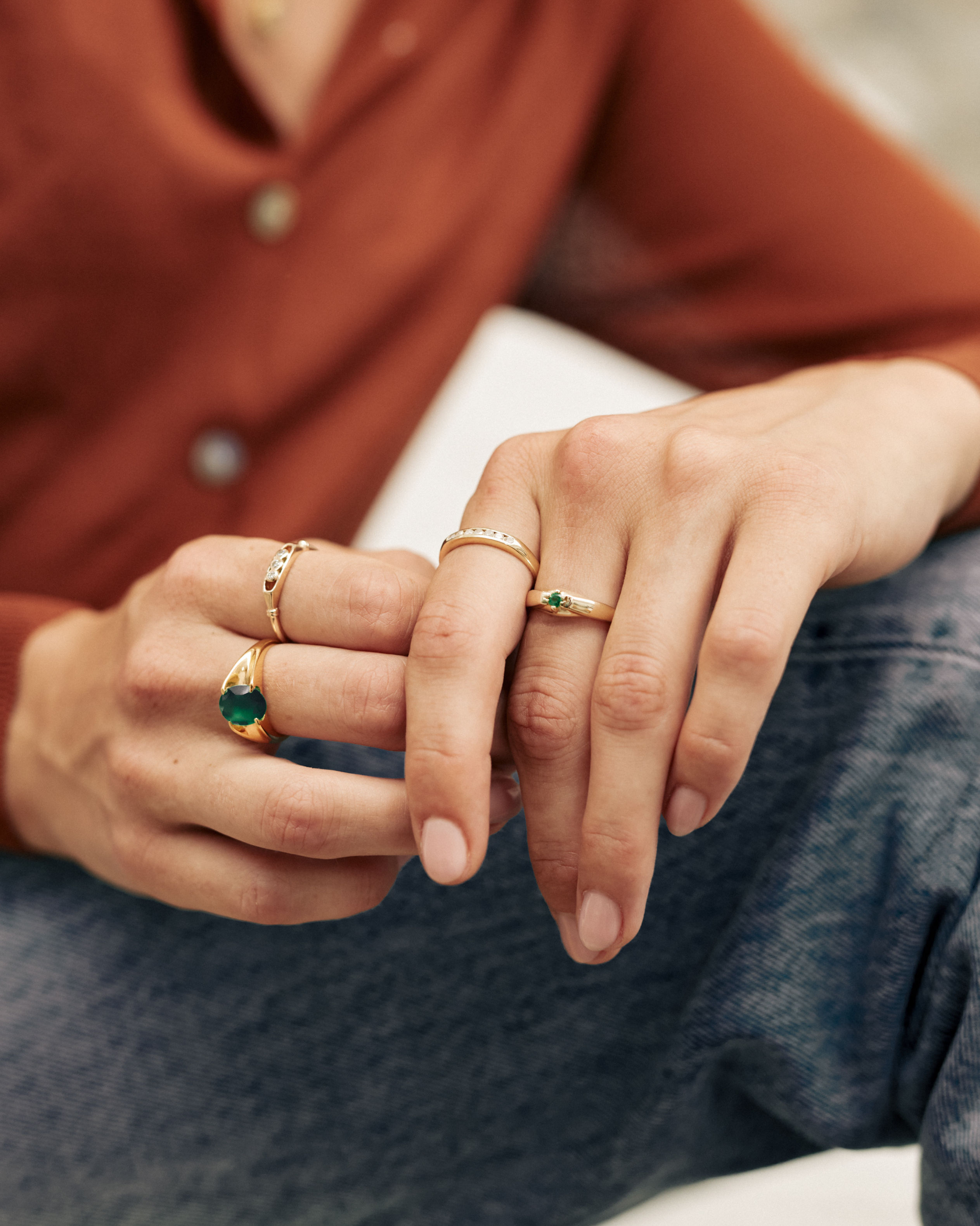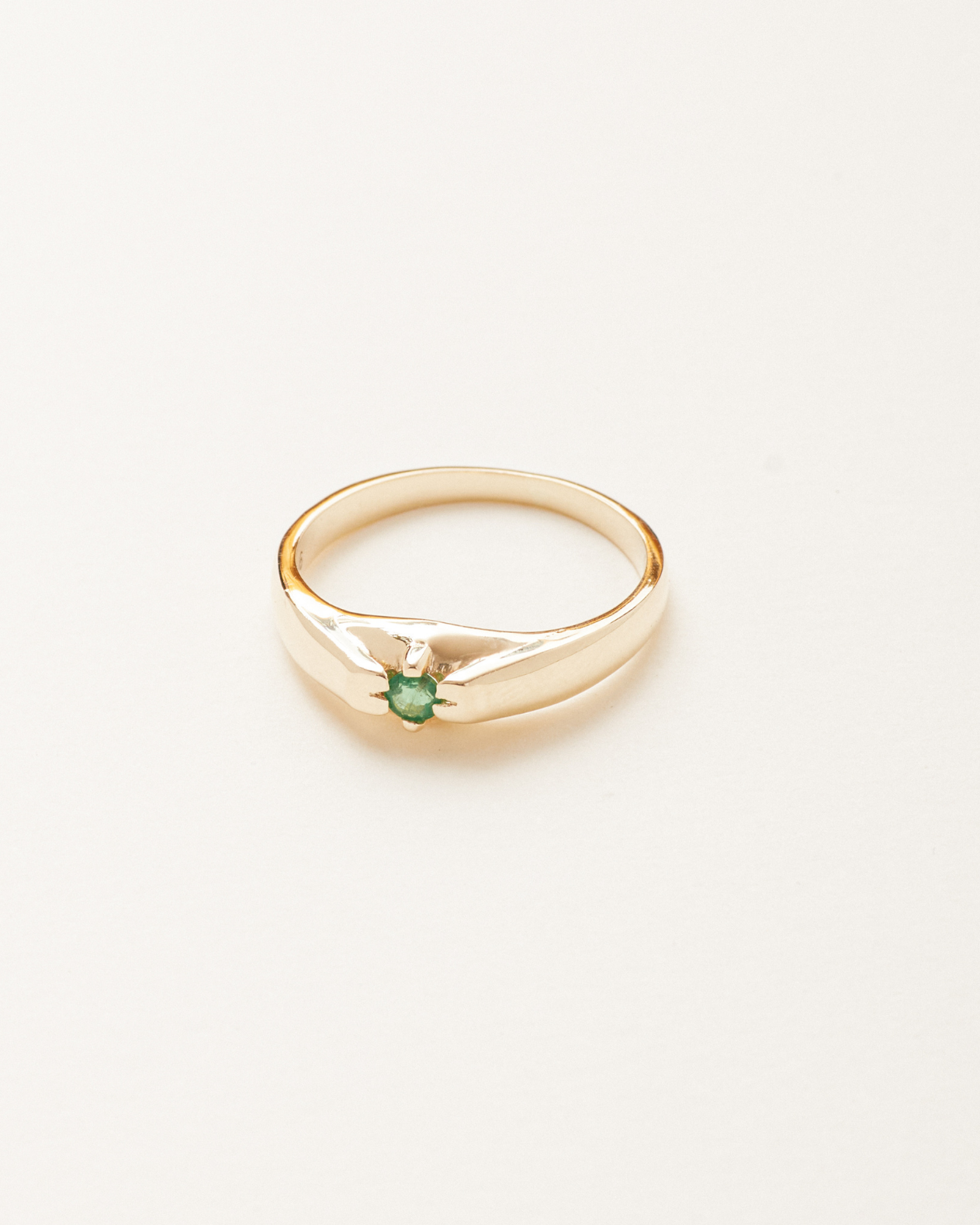 A wearable and striking fine jewellery ring featuring a central emerald stone.