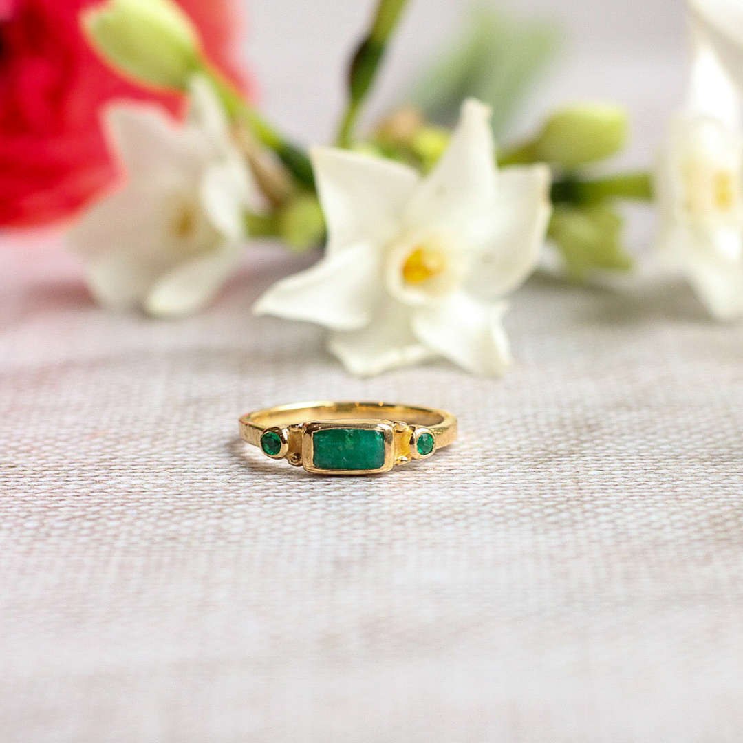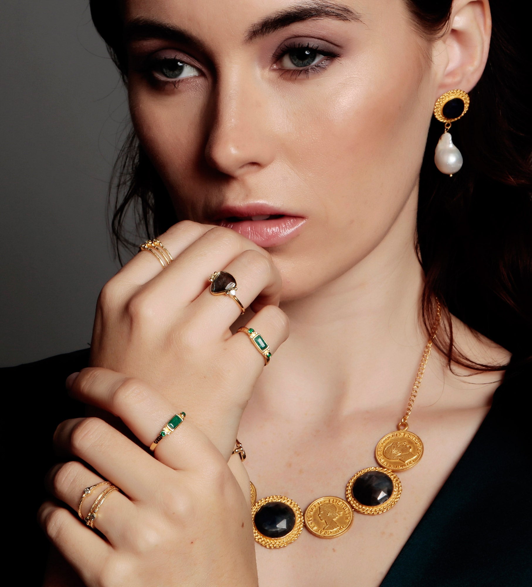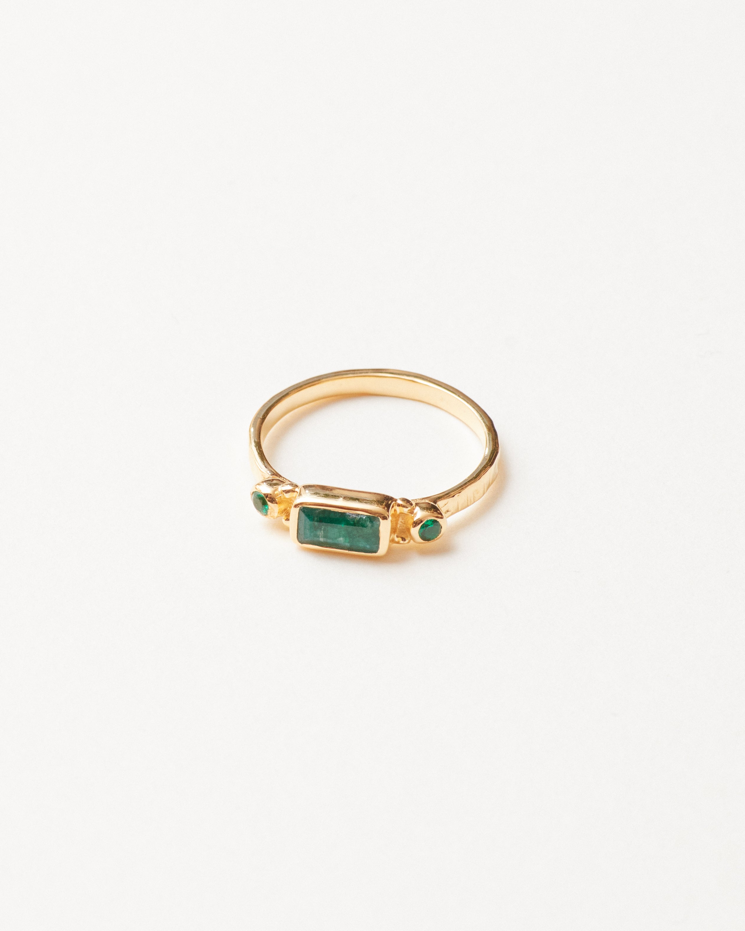 Our delicate green onyx and emerald corundum deco band can be worn alone or stacked. Crafted in 925 sterling silver and finished with a 22 carat gold vermeil plating. Also available in amethyst.