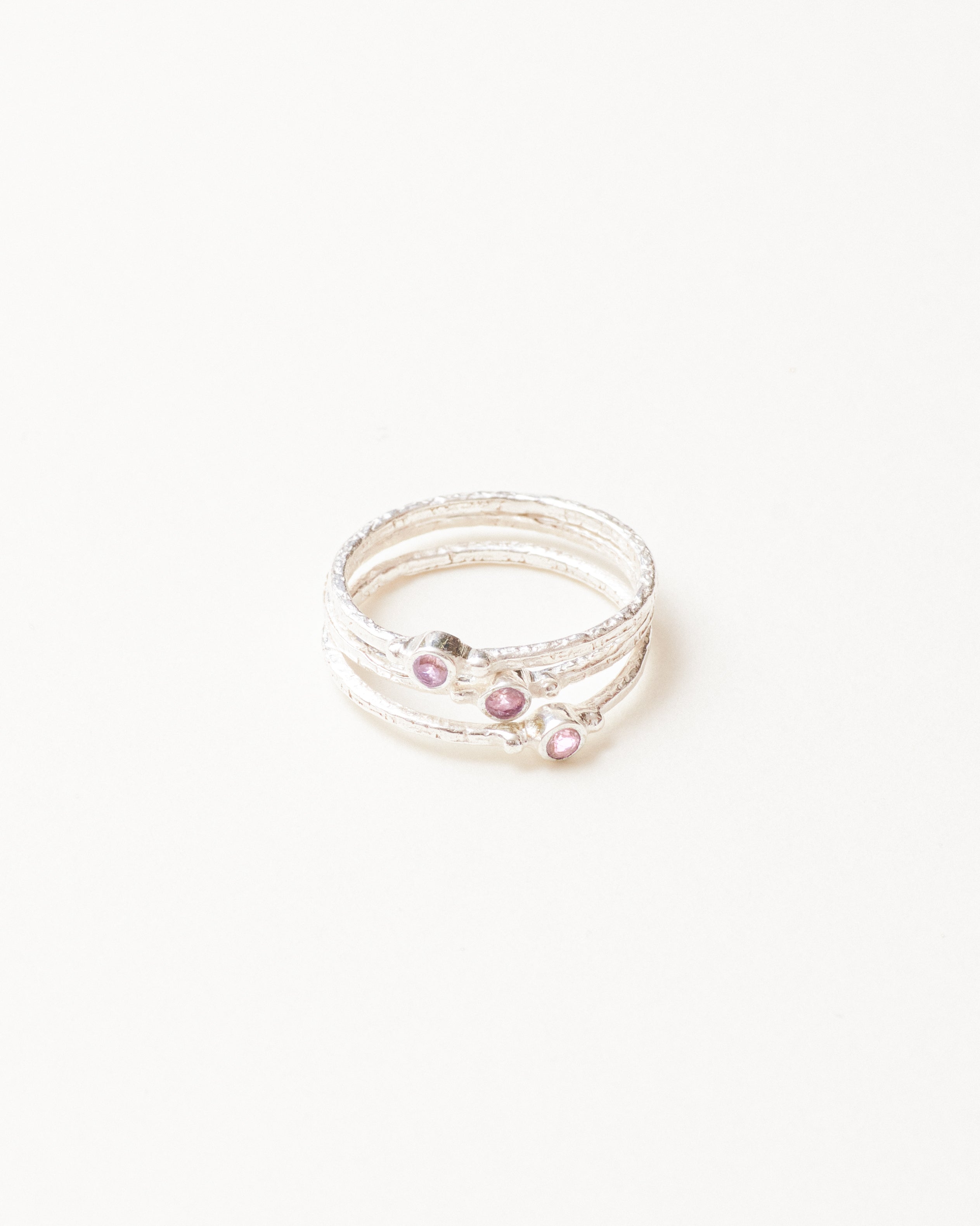 Silver circular amethyst stacking ring trio