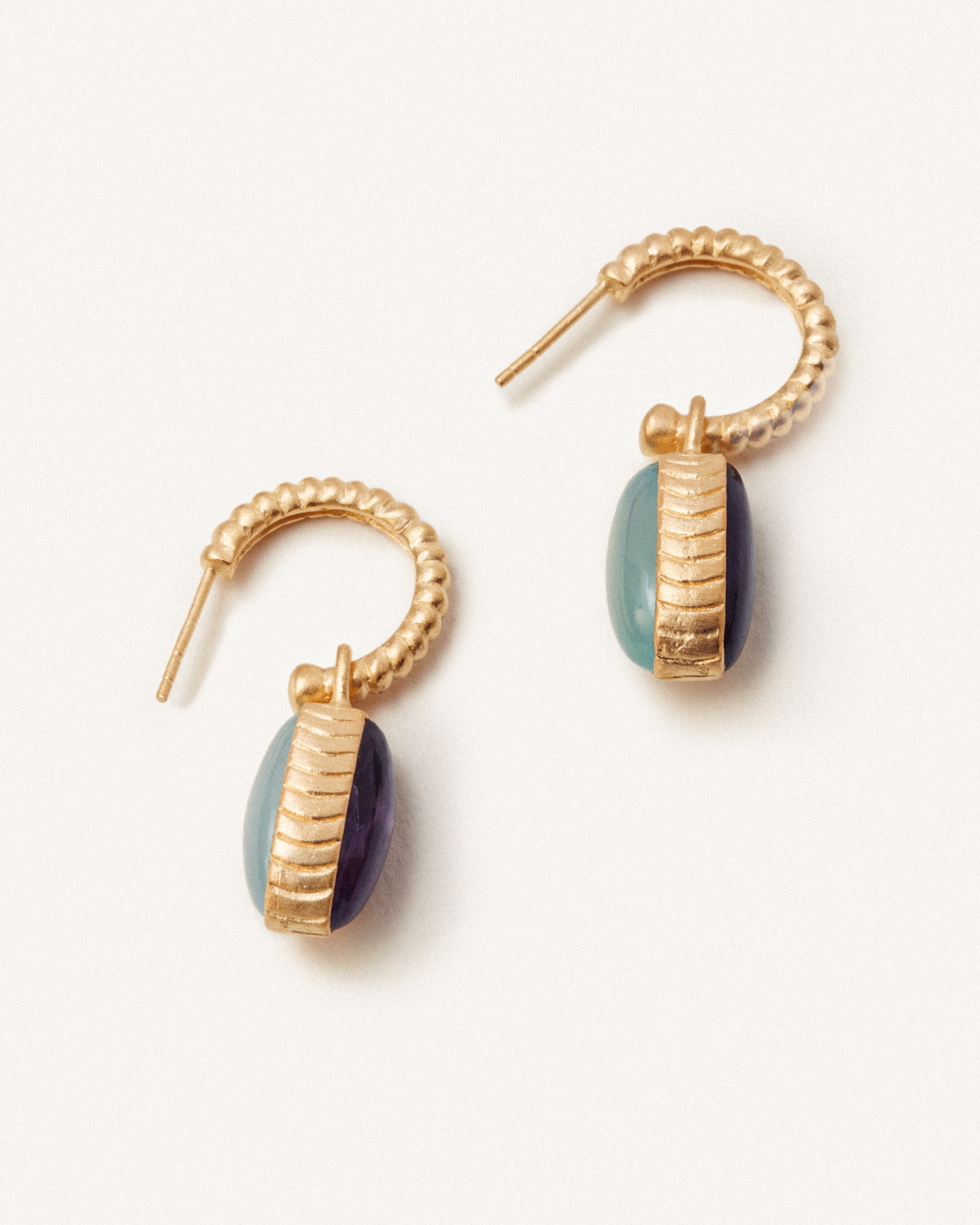 Our stunning Joni hoops are two earrings in one. We've set two gems on either side of the drop so that you can wear either way around. Each double gemstone drop easily detaches from the top of the hoop so you can wear these as either amethyst or chalcedony drops or simply wear the hoops alone.