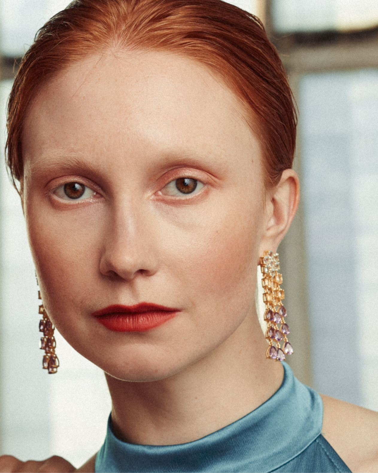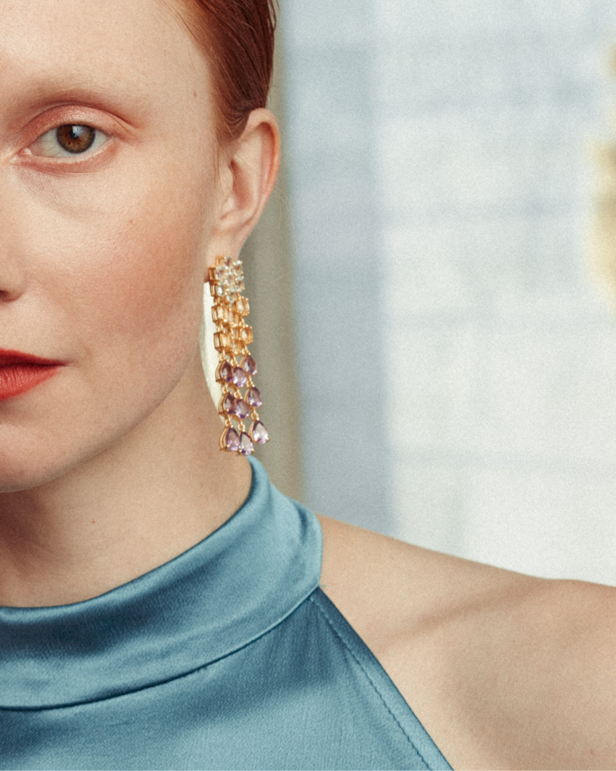 Lucia is a stunning new style in our collection. A true show-stopper. The hanging rows of gemstones provides plenty of movement and the faceted gems catch the light beautifully when worn. We love this stunning combination of blue topaz, citrine and amethyst.